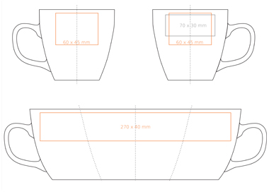 Print on the handle Print on the inside Print on the bottom inside Print on the bottom outside Decoration with stripe All around ovoid surface decoration Hand Made - rim painting Personal print |