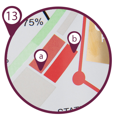 Comparison of colors achieved with CMYK (a) and Pantone (b) prints: