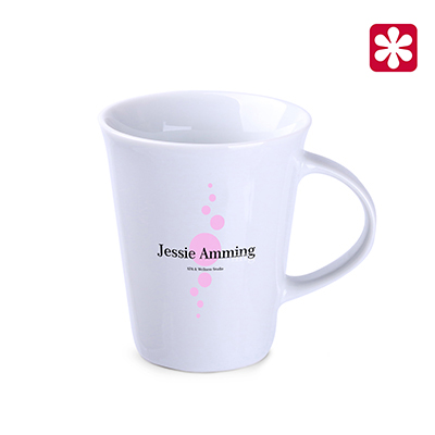 A best-seller porcelain mug with a large ergonomic handle. Its simple walls are the perfect background to showcase the brand's values.