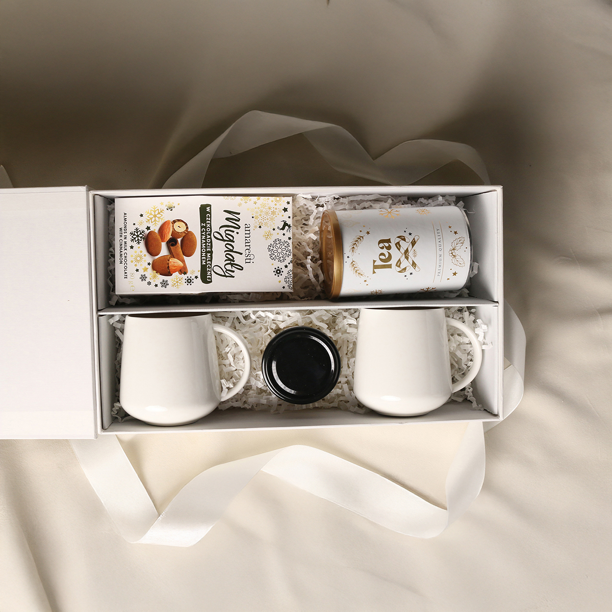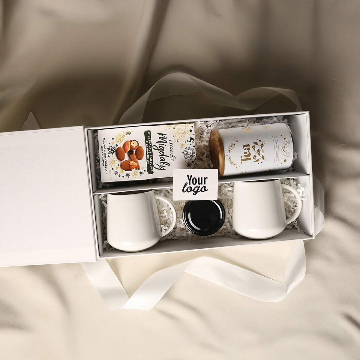 Elegant Melody porcelain mugs – 2 pcs Sweet almonds in milk chocolate with cinnamon Aromatic green Sencha tea with cherries, rose petals, and ginkgo biloba leaves 80g Natural artisan multi-flower honey 130g Exclusive magnet-closure packaging with the option to add a matching ribbon and banderole